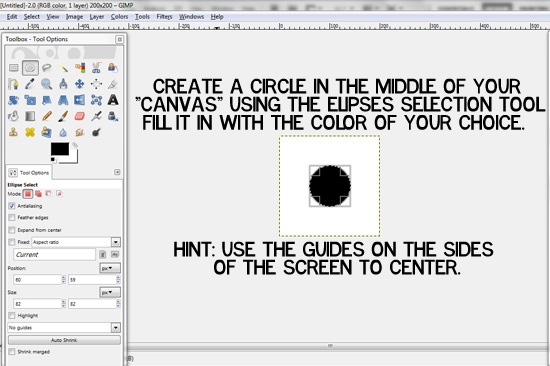 Once we have our image, we are going to create a circle in the middle. Use the ellipses selection tool while holding down the "shift" button on your keyboard to make a perfect circle. Make sure that your foreground color is the color that you want your dot to be, and then navigate to the "Select" drop down menu. At this point, select the "fill with Foreground color" option and your dot should turn that color. Then, using the move tool and the guides on the sides of the screen, center your circle.
